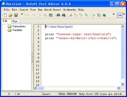 DzSoft Perl Editor是专门进行编辑、调试 Perl CGI scripts 的工具,带有详细的 HTML 格式的 Perl 帮助文档。