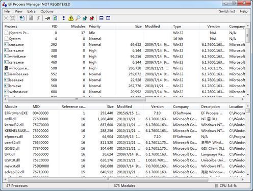 EF Process Manager用来让使用者了解看不到的在后台执行的处理程序,能显示目前已经载入哪些模块,分别是正在被哪些程序使用着,假如有不需要的程序,大可马上关闭,而不会影响操作系统继续正常执行。