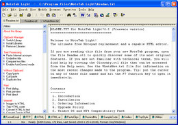 NoteTab light是一个超级的文字编辑器,除可取代Windows的Notepad外,它可编辑大的文件,在打列方面也能调整边界、页码等,它亦可读写DOS ASCII and UNIX等格式文件,对HtmL更提供了多种的工具,可轻易快速的编写。
