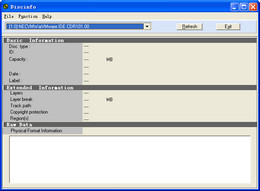 Discinfo是一款光碟信息抓取工具可以抓取光碟片的disc type, disc id, disc capacity, date code, disc Label, disc layers, Layer Break, Track Patch, Copyright, Region等信息,并可显示出Raw data。你还可以方便地将测试结果保存成TEXT文件或BMP图档。