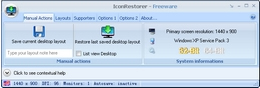 用来记住图标的位置,当遭遇情况时就不用手动一个个的把图标放回原来的位置。IconRestorer可以将图标轻松的放回原来在屏幕上的位置,还可以保存多份图标位置的设置图标在桌面上的位置,该软件支持用户自行手动执行备份操作,同时也支持自动保存,另外,不同屏幕分辨率的设置会独立保存。