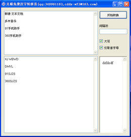 关联汉字转拼音是一款的免费汉字转拼音软件,它具备以下功能:中文转拼音;中文转拼音大小写 ;中文转拼音取首字母 ;中文转拼音加空格等间隔符