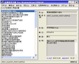一个学习注册表和修改注册表于一体的软件。软件提供了包含注册表操作方面的绝大部分,如系统性能优化、网络优化、各类菜单等等的修改,软件帮你自动定位在注册表的位置,说明改此键值的作用,而由你来明明白白的修改。
