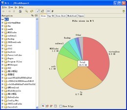 硬盘档案结构分析工具JDiskReport,不仅有完整的图表显示功能,当您点选某个资料夹,在Top100的选项里,还可以依序排列占空间的档案。