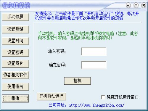 省心挂机锁是当今智能的挂机锁,可以非常方便的锁定电脑,对我们的电脑挂机,可以锁定屏幕,锁定键盘及鼠标,不输入真确的密码无法进入电脑,挂机完全自动化,挂机前不需要任何操作,只要设定的条件满足马上自动挂机锁屏.软件对于所有的设定都有记录功能一次设定永久使用软件特点1:省心电脑挂机软件操作方便,适合于学校公司及个人使用2:所有的锁定都实现自动化,不须要人为去挂机使用极为方便3:软件本身有软件密码,可以设置自己习惯的快捷键所定电脑4:可以修改软件密码,可以设定固定时间挂机(如中午吃饭时间12:00)等到12:00电脑自动挂机,在你要临时离开电脑的时候可以使用开始设置的快捷键挂机,5:利用软件密码挂机,挂机时不要为输入密码而烦恼6:软件可以设定多长时间不操作自动挂机7:挂机时对电脑没任何影响,所有设置永久生效8:软件初始密码是123,用软件密码挂机不再需要每次挂机输入密码,软件密码可修改