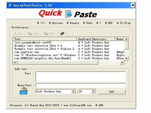 快速粘贴文本是一个便携式的小程序,允许你插入(粘贴)在任何Windows应用程序,通过键盘快捷键快速预先定义的文字。该程序还允许你通过键盘快捷键运行命令和程序。与此Windows桌面工具保存的时间和拼写错误。