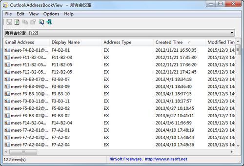 OutlookAddressBookView是一个简单的工具,显示存储在Microsoft Outlook中的地址簿中的所有收件人的详细信息。对于每一个收件人条目,会显示以下信息:电子邮件地址,显示名称,地址类型(MS-Exchange或SMTP),街道地址,电话号码,创建时间,修改时间(只适用与Exchange服务器的地址簿),你可以很容易地从列表中选择一个或多个收件人和导出到tab-delimited/comma-delimited/xml/html文件,或者将它们拷贝到剪贴板,然后粘贴到Excel中的列表。