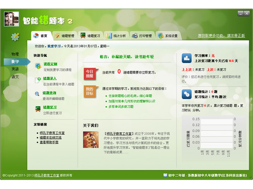 师孔子教育工作室开发的智能错题本,充分利用计算机技术,创新多项新的技术和理念,将“错题本”的理念用计算机技术进行全方位的展现,实现了数据录入、检索、信息处理、统计分析、人机交互、错题管理等的智能化,更是实现了对每一道错题掌握度的精准“靶向”定位,让错题本这一“查漏补缺”的教育理念,真正变成可以通过简单操作而实现的一个事实。1.全功能的编辑技术,让错题录入随心所欲 智能错题本提供了功能强大的编辑功能,不但可以进行文字编辑,还可以借助摄像头、照相机、扫描仪等设备,将纸质考试卷、教材教辅、网上资料、甚至是你的作业本,只要你认为它有保存价值,都可以通过数码相机、手机拍照、扫描仪、甚至电脑中图像抓取工具通过系统的粘贴板进行图像输入,实现了录入错题的一场革命,让录入错题过程极其简单。 2.丰富全面的错题信息,轻松实现精准“靶向”定位对每一道错题不但包含题目、答案分析、心得体会,还包括错题来源、考试类型、错题原因、难易程度、题目类型、知识点等多达14项信息,为让学生加深对错题的记忆,还专门增加一个“错题重现”栏目,原汁原味收录错题过程。丰富的错题信息,借助计算机的数据统计分析技术,可以实现在复习过程中对每道错题的精准的定位和分类,准确找出学习中的薄弱环节,为提升学习效果提供充分的数据支持。 3.独创五级错题掌握度评价体系,让错题评价更科学 打破了传统的那种简单的对错考核方式,独创以掌握度为核心的五级评价体系,更科学地揭示错题形成的深层次的原因,而不是简单地以一个对错来衡量,让错题的正误评价更能体现思维过程。有利用学生更好地形成正确的解题方法和思路。而且实行五级柔性评价,更好地利用了计算机数据处理技术对错题进行更加合理地分类。为复习的差异化提供了较为准确的技术支持。 4.独创复习与评测相结合多种复习模式,实现复习评 测一体化建立错题本的目的在于解决学习中的问题,系统围绕掌握度这一核心理念,将复习与统计分析以及评测相结合,创新了多种复习和评测测方式,同时,结合数据统计分析数据,充分利用系统提供的对错题的六纬数据信息,实现对错题掌握度的动态评价和动态管理。 5.体现科技以人为本理念,界面与功能应用设计更加人性化 资源都通过下载方式取得,不需再专门建立目录库,录入直接与课本目录对接,做到错题录入与学习内容同步。系统提供几乎全国各地不同类型教材和版本的目录资源下载,同时为照顾一些特殊客户的需求,还提供自建目录库功能;提供的提醒功能,系统提供了默认方式 ,但也允许用户自已根据情况加以修改,而且提醒方式也进行了人性化设计;将系统主要的一些功能放在首页,方便用户更加快捷地操作;体现个性化需求。
