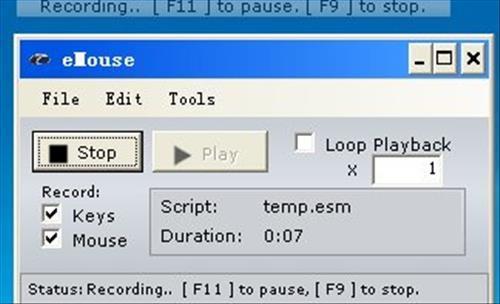 Emouse可用来记录和回放的键盘和鼠标输入动作,并保存为ESM脚本文件,可再次再次播放或使用编辑器进行编辑。软件使用AutoIt的代码合成工具,可轻松地创建和转换AutoIt编写的代码。