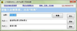 小写数字转人民币大写,绿色,免费 详细说明: 人民币数字大写转换器,输入数字即可转换成对应的人民币大写金额,并且可以转换成两种方式,只需一键点击,即可复制。是财务办公人员必备的小工具。 免费,绿色,免安装,方便实用!