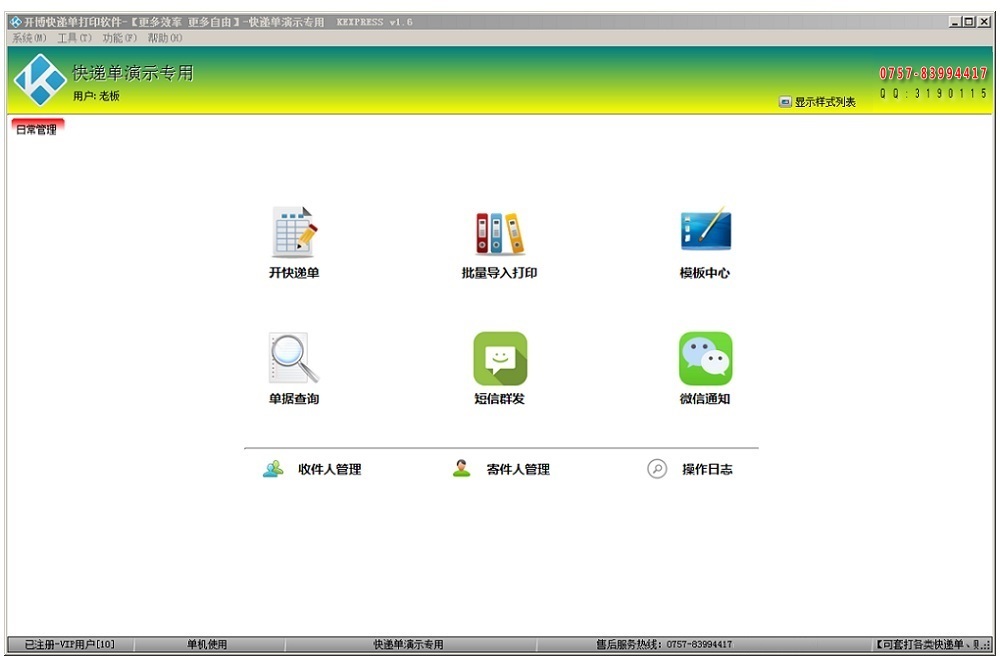 开博快递单打印软件(简称:KEXPRESS)专用于套打各种单据,操作简便快捷,界面清晰易懂,兼具灵活且强大的自定义配置功能,可同时打印普通快递单和热敏电子快递单。相比较其他同类软件,KEXPRESS不仅仅能胜任打印快递单,还可以方便扩展到如下的套打场景:银行票据、财务票据、财政税务、协议合同、销售发货及仓存进出库单据、售前售后服务单据、工作联系单据等等;同时,KEXPRESS采用先进的多层架构和高效数据库存储技术,支持联网多用户同时使用,也可直接放U盘使用。