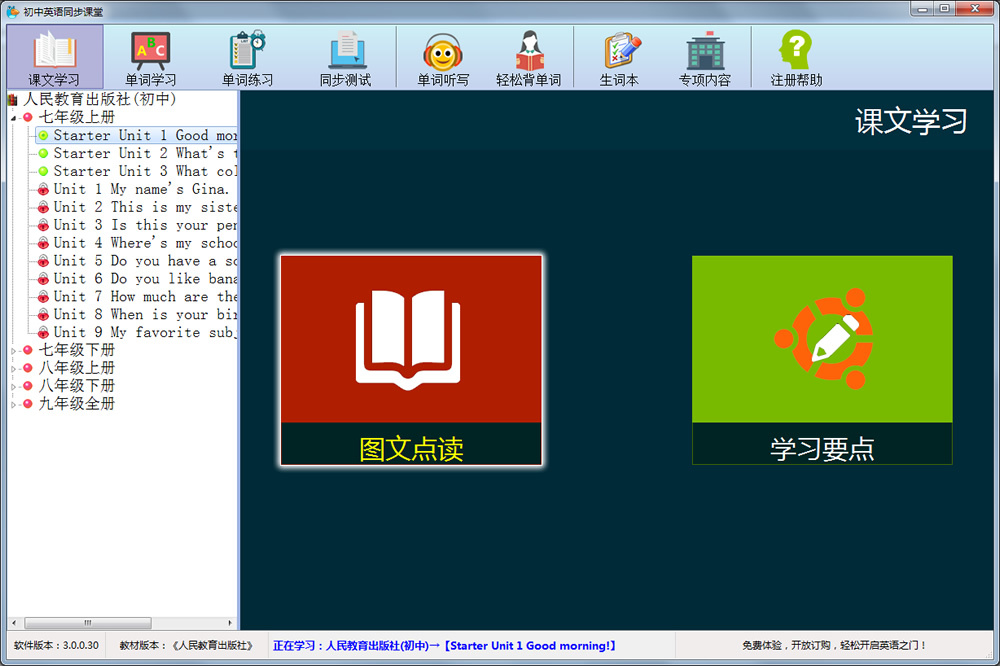 软件与初中人教版、外研社版最新版英语同步!英语课文、单词全部为原声真人发音,课文有图文点读和翻译,而且有课文题目的解析,这对初中英语学习非常重要。课本图文可以缩放;点读时可以调整语速;还可根据课文自己录音;每个单元都有要点学习。单词都有真人中、英文发音,绝不是机器发音可比。同步测试内容非常丰富,包括听力训练及主观试题,针对性强,还可完美打印!