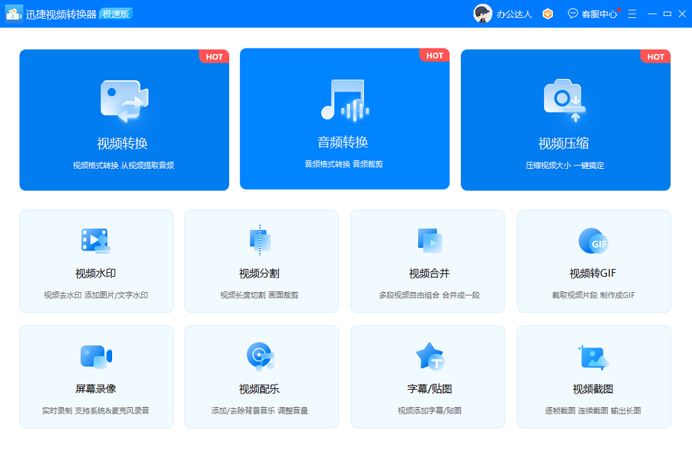迅捷视频转换器支持MP4、AVI、MP3、APE、FLAC等多种音频、视频格式的转换,同时还提供音频转换、屏幕录像、视频压缩、视频加水印、视频去水印、视频合并、视频分割、视频转GIF、视频配乐、视频截图、视频美化、视频加字幕等功能,帮助用户快速批量完成视频处理。