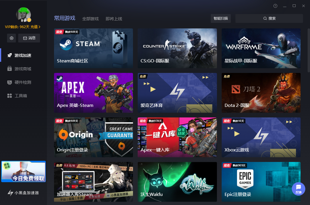 开启黑盒,极速游戏。小黑盒加速器已经上线,支持海量游戏加速,热门新游免费加速。全球专线、尽享极速、极简操作、一键畅玩。
