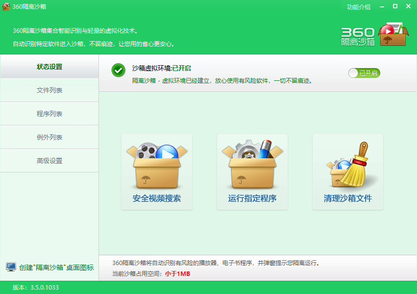 360安全卫士中的一个功能,而现在有着独立的隔离沙箱能够运行,并且还能够提供安全的隔离运行的空间,保证用户的软件使用不会妨碍到电脑,并且不用担心电脑会中毒了