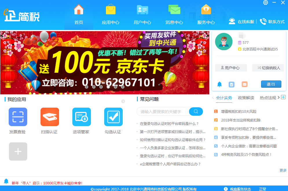 e企简税是一款基于总局“互联网+税务”理念打造的互联网办税平台。平台的应用广场中为纳税人提供了多款办税软件,包括扫描认证、勾选认证、发票查验等功能,应用的种类将不断增加;资讯广场中贴近政策的热点解读、法规政策及会计实务等版块,满足办税人员的学习需求;自助服务版块中,用户可自行查询热点问题及解决办法,也可一键直达我司专业客服人员,进行一对一解答。