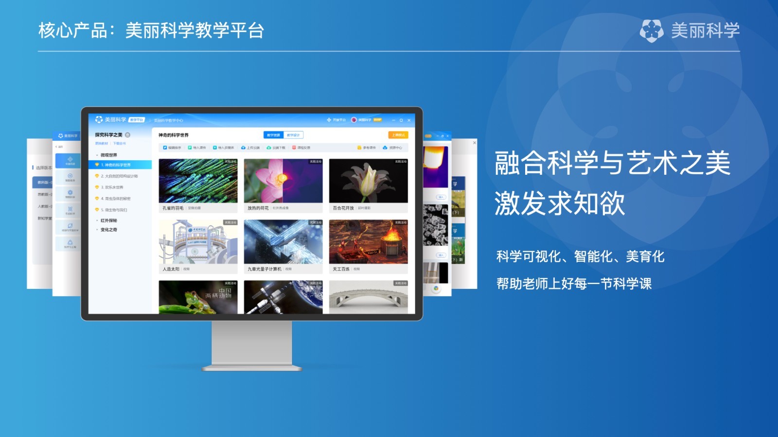美丽科学教学平台秉持“融合科学与艺术之美,激发求知欲”的理念,是为科学老师倾心打造的专业备授课教学平台,帮老师上好每一节科学课。平台已得到教育科学出版社官方授权联合研发支持,并已获教育部国家数字教育资源公共服务体系备案认证。平台数字化课程资源与《科学》教材完全同步,以科学可视化教学资源为特色,倡导数字化观察、探究与教学。目前平台已在全国超过2万所学校成功应用,服务超过3000万师生。