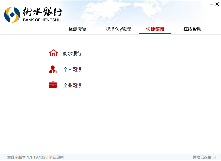 衡水银行网银用户打造的安全工具,衡水银行网银助手官方版是一种能够让用户低风险地使用网上银行的安全软件,衡水银行网银助手官方版是用户在使用网上银行之前必须安装的网银安全控件,软件能够一键安装所需插件以及快捷登录网上银行。