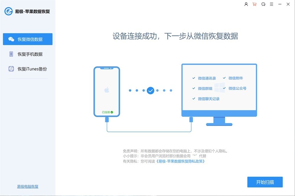 易极苹果恢复是一款专业的苹果手机数据恢复软件,它有友好的使用者体验和向导操作,您只需三步骤即可恢复数据:扫描-预览-恢复成功!它可以恢复iPhone/ipad的丢失数据,包括照片、视频、通讯录、书签、提醒和日历,也可以找回微信/qq等已删除的联系人、聊天记录、微信群、公众号、微信附件等!同时还可以进行iTunes的数据备份,让你的手机不再担心数据丢失!易极苹果数据恢复——30万+用户丢失数据后第一时间的选择!