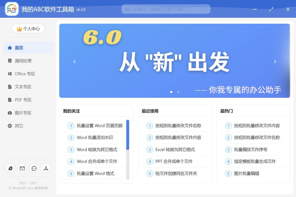 这是一个小而美的办公软件工具箱,集成了几十种文件批量处理功能,如:批量修改 Word、Excel、PPT 和 PDF 及文本文件的内容、批量修改文件和文件夹的名称、批量文档格式转换、批量图片压缩、批量按顺序编号、批量生成文件、批量拆分合并文档等等