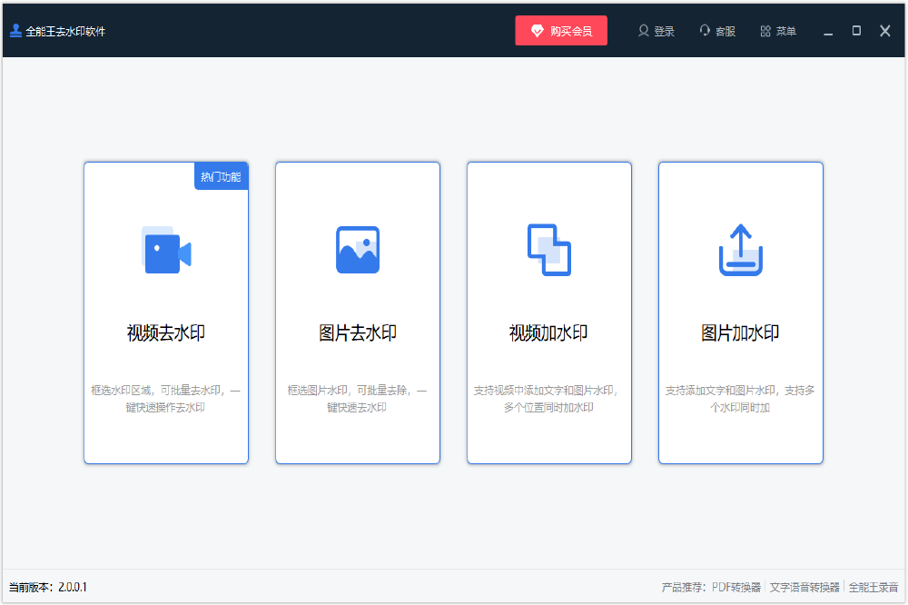 全能王去水印软件,是一款去除水印的软件,支持去除图片、视频上的水印,也是一款功能强大的去除水印工具。功能有视频水印去除、图片水印去除、图片水印添加、视频水印添加等功能。