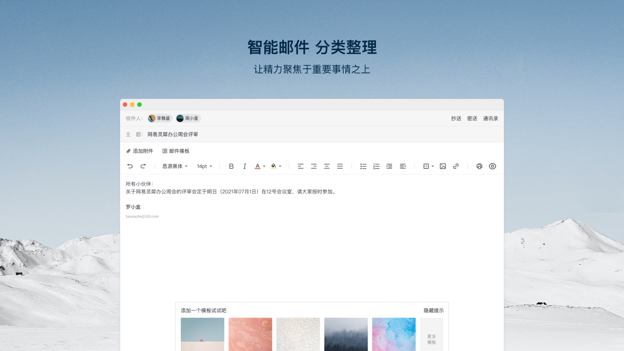 网易灵犀办公,一款专为企业定制的智能协同办公平台。以企业邮箱为基础,整合即时沟通、日历、在线文档、云盘等功能于一体。全面激发人与组织的潜能与默契,打造实时化、智能化、一体化的全新办公体验,引领办公行业效率变革。