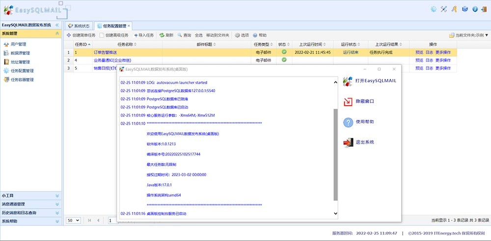 EasySQLMAIL具有成本低、安装部署简便、配置灵活等特点,能够快速地为企业提供内部信息推送服务。软件可以支持的推送方式有电子邮件、企业微信、钉钉;可推送的信息格式有文字信息、HTML文档、Excel表格、PDF文件、图片等。