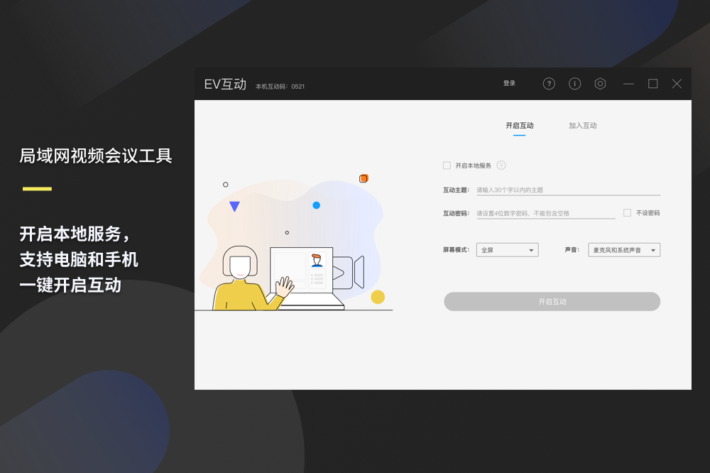 EV互动,适用于企业内网、局域网的内部会议互动工具。EV互动是一款支持企业内网、局域网的会议互动工具。EV互动支持音频、视频、文字聊天等多种互动形式。简单操作,主持人一键轻松开启内部会议,会议成员即可在内网搜索加入。EV互动支持PC、IOS、安卓等多终端平台。支持桌面画板等小工具,帮助更好地进行会议演示。适用于多人圆桌会议、小型内部会议等多种场景。