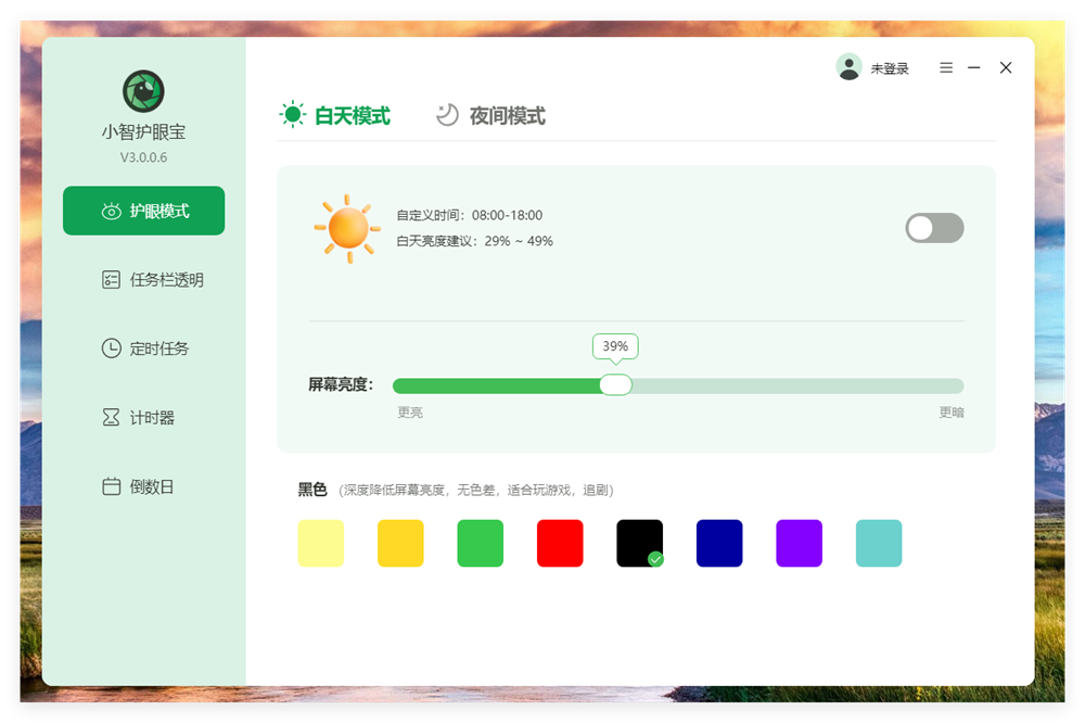 小智护眼宝是一款高效简洁的多功能护眼软件。小智护眼宝通过高效过滤蓝光,根据昼夜规律,满足颜色敏感群体对于各时段的护眼要求,对比护眼精灵、护眼卫士和f.lux ,小智护眼宝提供多种护眼颜色调节,可开启不同护眼模式,智能调节护眼亮度,最大限度降低电脑蓝光对眼睛的伤害,高效护眼;支持倒计时、倒数日、定时关机、定时重启、定时睡眠、定时注销、定时锁定、定时关闭显示屏、定时提示、定时打开软件、定时清理回收站、定时清空文件目录等多项定时任务,额外支持每天、倒计时等定时模式;具备任务栏美化功能,支持不同颜色美化任务栏,对比TranslucentTB,任务栏透明度支持自由调节,同时支持模糊、亚克力等美化模式。小智护眼宝高效护眼,界面简洁、兼容多功能自由设定,完美助力电脑办公用户护眼问题,是一款强大的智能护眼软件。