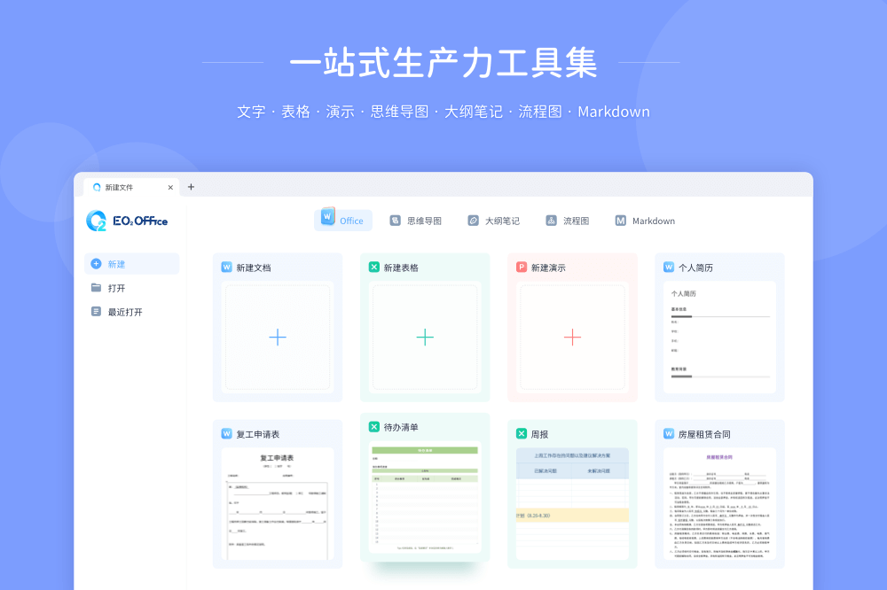 怡氧是一款将Office、思维导图、大纲笔记、流程图、Markdown文档集于一身的办公工具套件,致力于为职场人提高办公效率以及应对职场各种需求,为其打造简洁便利的文件生产环境。