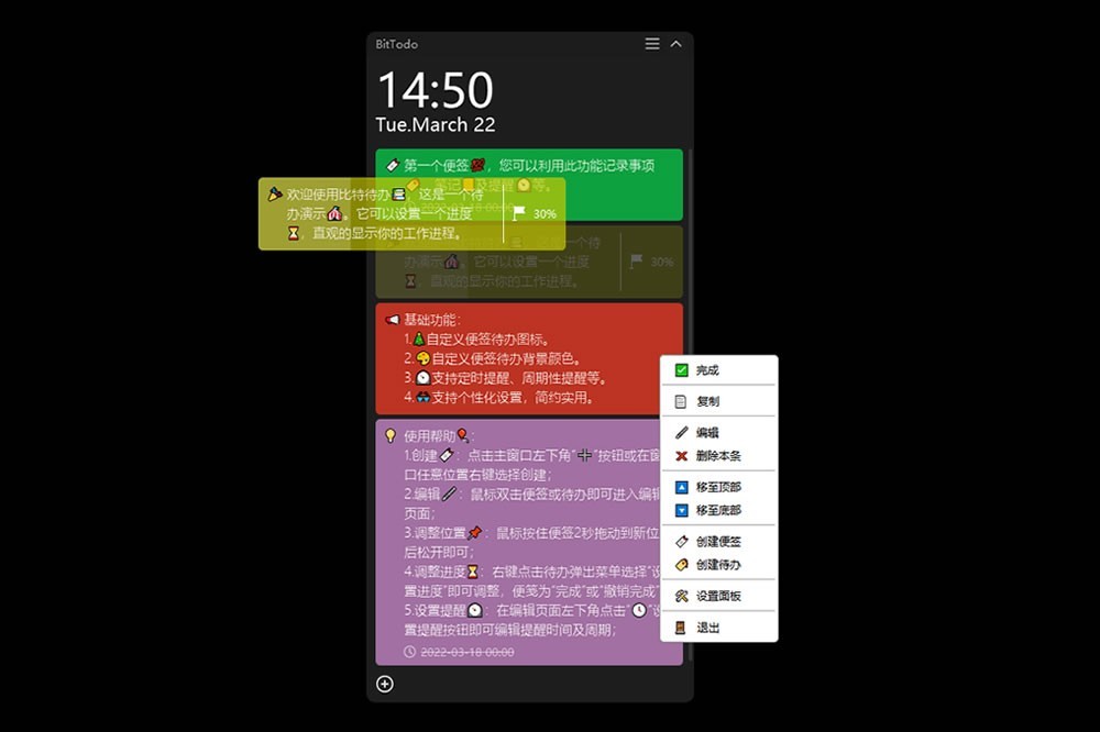 BitTodo是一个简洁高效的日程管理工具,你可以方便的管理你的日程,给自己更好的日常规划,记录你的工作,了解你的进度情况,以及写日记,留下美好回忆,支持右键创建、编辑,同时支持拖拽排序功能。