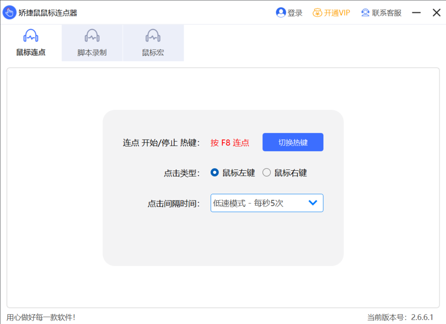 矫捷鼠鼠标连点器是一款可以连点鼠标的鼠标连点器软件。支持鼠标连点,鼠标脚本录制,鼠标宏,脚本开发,脚本播放等功能。支持辅助您实现办公自动化。软件功能简洁易用,非常方便操作。矫捷鼠鼠标连点器让您在玩游戏、网购抢购的时候全自动点击鼠标!主要功能有: 1. 支持快速鼠标点击, 一秒可高达几百次次点击。 2. 鼠标连点器可录制鼠标和键盘的操作,可以循环回放脚本。 3. 可播放脚本代替你进行各种操作,一键升级、自动挂机、游戏刷分。软件官网:https://mouseclick.letututec.com