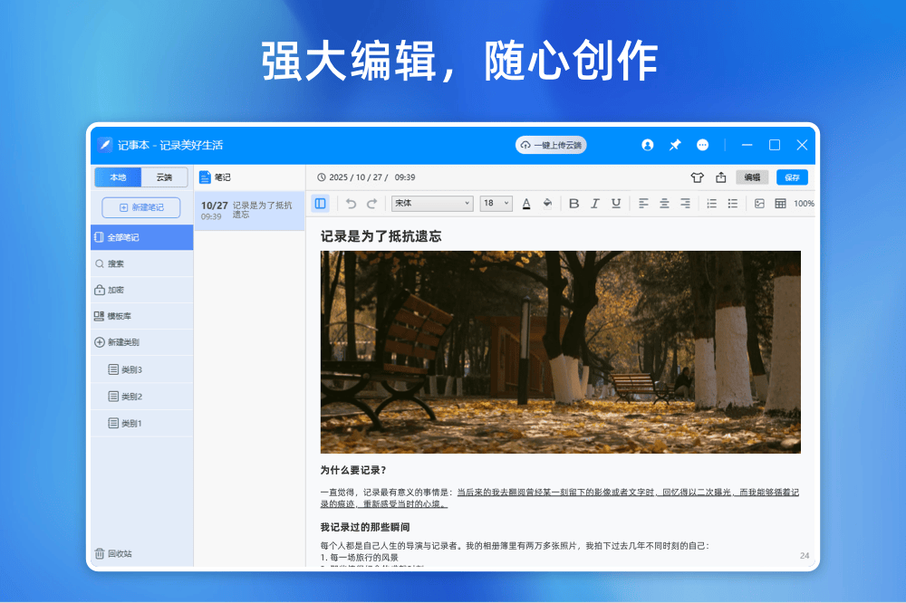 幂果备忘录记事本软件是一款专为电脑用户设计的记事软件,可以快速的记录和保存任何文本、文字、资料和知识。写便签备忘录时,内涵色彩缤纷的便签类别,可以让你的备忘录手账更具个人特色。备忘录记事本支持全文搜索,无论任何时候,想立即记录文字和知识,打开记事本即可随时记录!
