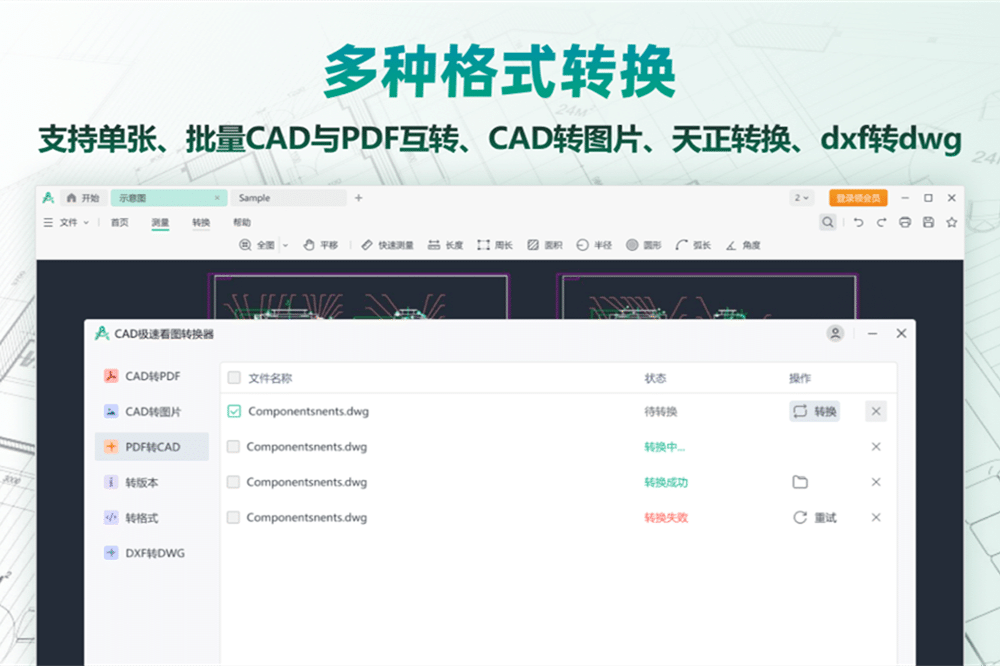一款小巧、简约、专业的CAD看图软件。它能极速打开多种格式的CAD图纸,精准渲染图纸的工程细节;支持多种视图的图纸打印、颜色选择与线宽调整打印;快速测量轻松解决各种复杂的测量问题;转PDF、转图片、转版本、转格式、dxf转dwg等,支持多种格式互转;优秀的交互设计,简单的图层管理,丰富的引导提示,轻松提取表格与文字。