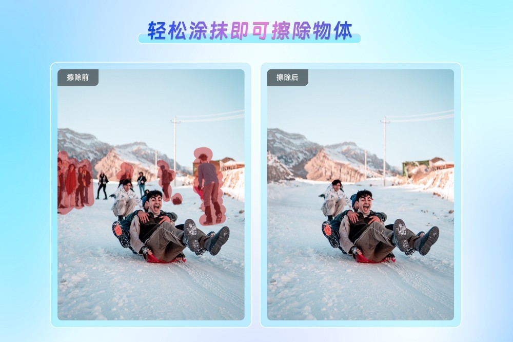 【删除物体】采用手动涂抹擦除和自动识别擦除结合,能快速擦除照片中不需要的物体,提供多种擦除效果以支持多种擦除场景。
