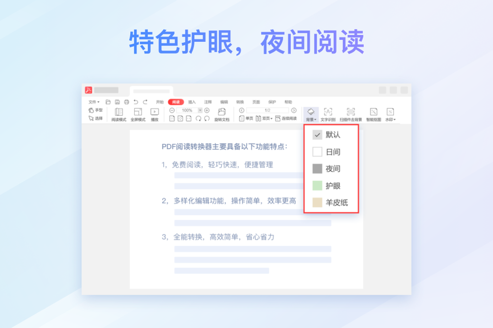 PDF阅读器:贴近原生office界面沉浸式阅读体验,多种阅读模式适应各种使用场合,有效减缓眼睛疲劳就用护眼模式阅读。