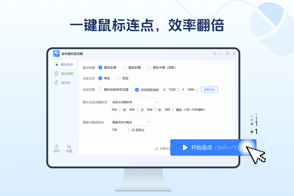 鼠标连点器,鼠标录制,定时点击器,鼠标录制回放,鼠标宏,金舟鼠标连点器一款专为效率而生的鼠标连点软件,它能够让您的鼠标自动执行连续点击,省时省力更高效,同时还支持鼠标录制回放,自定义鼠标宏脚本,定时执行任务等功能,作为专业级的连点工具,它能轻松应对各种繁琐操作,是游戏玩家的得力助手,也是网购达人的秘密武器。 【功能特点】 一键鼠标连点:一秒可高达1000次点击,轻松实现连续点击,让工作效率翻倍。 鼠标动作录制:录制并回放鼠标动作,简化重复性劳动,节省宝贵时间。 自定义鼠标宏:根据个人需求创建专属的鼠标操作宏,一键执行复杂任务。 定时任务自动执行:设置定时任务,软件自动执行,释放双手,享受自动化便利