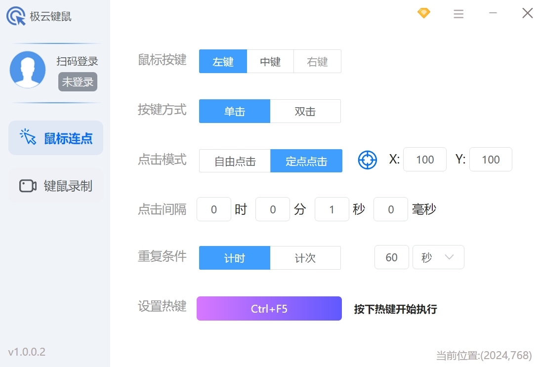 极云键鼠是一款用于模拟键鼠操作的软件,支持鼠标左右键及中键点击,满足不同需求,点击事件多样性,可以实现鼠标每秒快速点击1000次,精度高更稳定;同时还支持鼠标键盘录制,自动循环回放,让游戏挂机不是梦,彻底解放双手。界面操作简单,功能高效稳定。