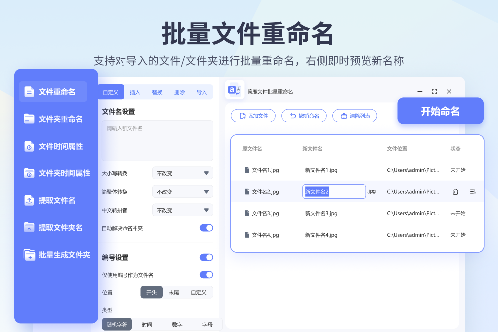 简鹿文件批量重命名,可以帮助用户批量修改文件名,提高文件管理的效率和便捷性。以下是该软件的主要功能介绍: