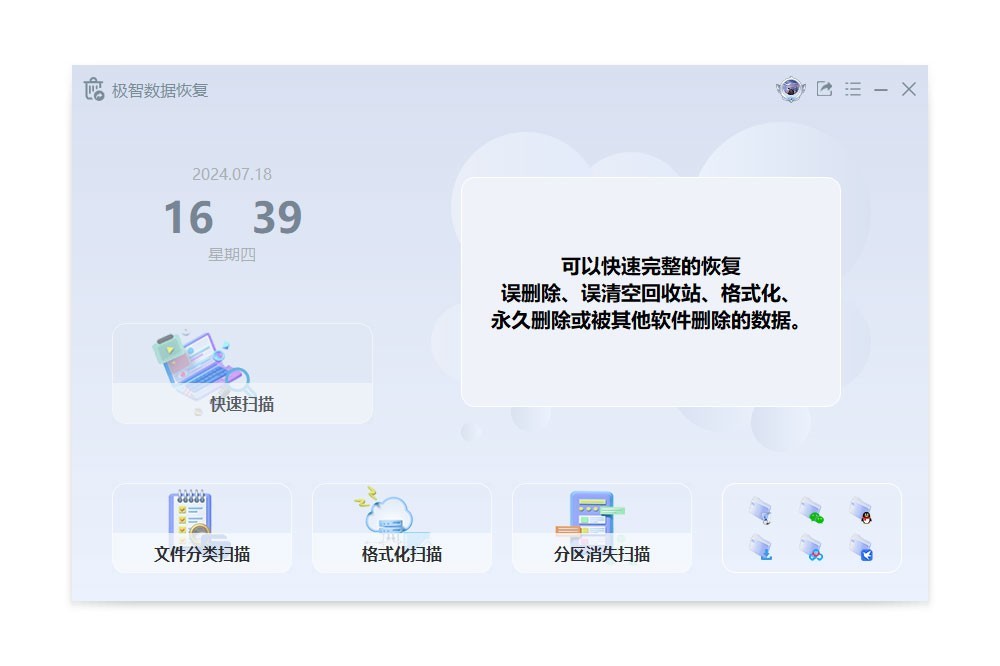 一款完全免费、智能强大的数据恢复软件,提供快速扫描、文件分类深度扫描、格式化扫描、分区消失扫描等多种扫描模式,操作简单,可快捷恢复误删除的文件,找回丢失的数据。 同时,提供快捷打开微信文件目录、QQ文件目录、迅雷下载目录、百度网盘下载目录等便捷功能。