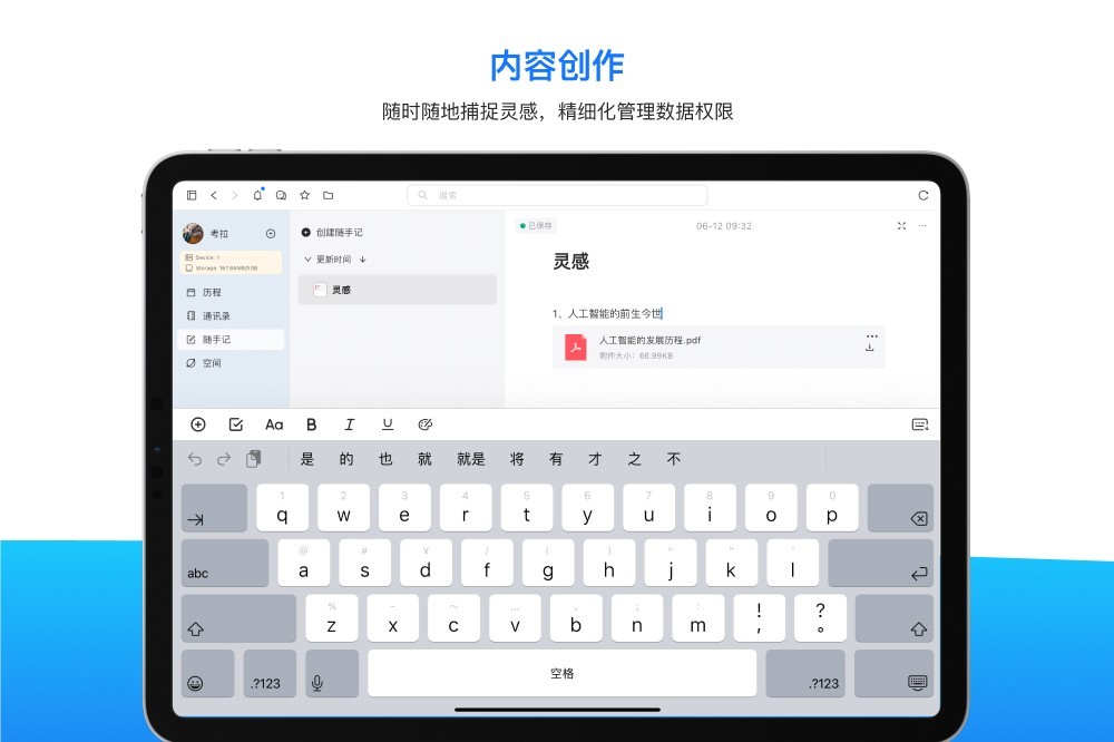 富格式内容支持。支持文字类、列表类、表格类、图片类、文件类等多种内容格式,功能强大,使用简单。可以记录所思所想,撰写精品文章,创作鸿篇巨制。