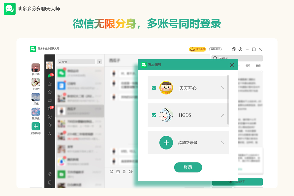 聊多多分身大师,专业的多个微信管理工具,通过多年研发的黑科技,实现了多个微信的管理,能够分类的添加文案话术,表情,文档管理,等相关功能实现了快捷发送消息,快捷管理消息的功能 产品的功能 1:多个微信管理 2:对微信没有任何影响 3:没有任何广告 4:快速管理话术文案,文档表情等相关操作 5:多个微信任意管理