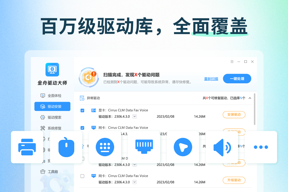 万能驱动,驱动下载,驱动更新,驱动程序,打印机驱动,dll系统修复;金舟驱动大师是一款全面而高效的驱动管理工具,旨在为用户提供一站式的驱动更新解决方案。它不仅能帮您解决显卡驱动、声卡驱动、网卡驱动安装,还扩展到了电脑系统修复、打印机驱动修复等实用场景,满足用户对电脑驱动管理和修复的多样化需求。