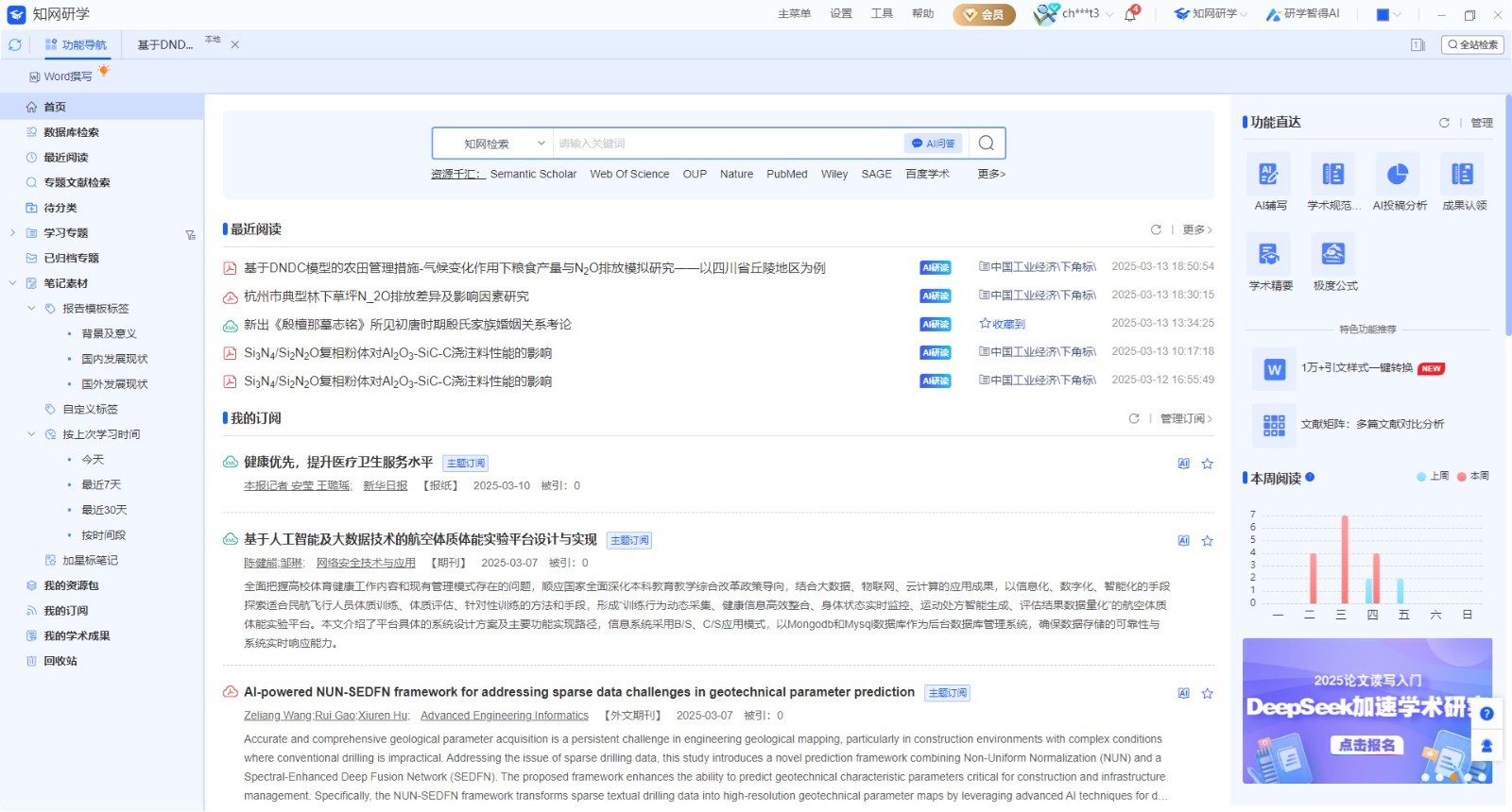 平台支持多模型AI问答(DeepSeek,华知大模型等),可基于知网全库文献提供专业回答,回答内容可追溯来源文献;内嵌多个中英文数据库,可快速检索添加文献;支持订阅期刊、RSS、学科、主题等,及时发现最新资源。