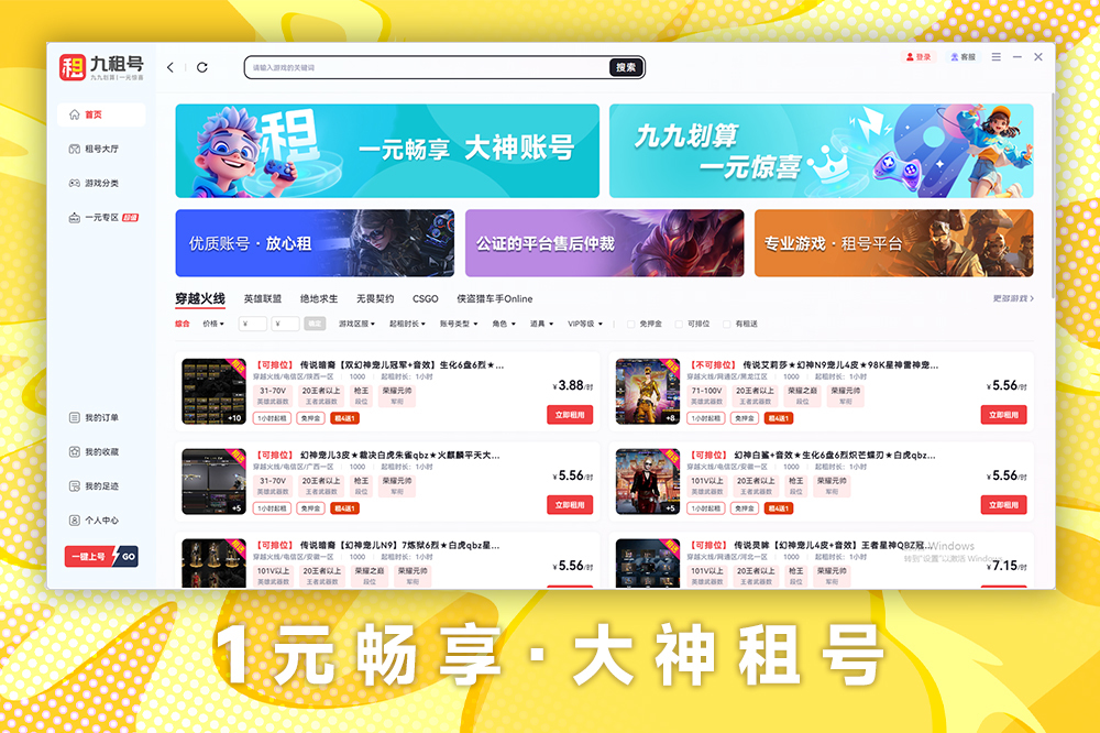 九租号平台是一款专为游戏玩家提供高端账号和道具体验的服务平台,旨在通过低廉的租赁价格,帮助玩家在不承担高昂费用的情况下,体验顶级游戏账号和稀有道具。玩家可以在平台上轻松租用各种游戏账号,享受与高端玩家相同的游戏体验,从而做出更明智的购买决策。平台的宗旨是降低玩家的游戏消费门槛,让每一位玩家都能以更少的投入,感受更多的游戏乐趣。同时,九租号平台提供丰富的游戏选择和多样化的账号租赁,满足不同玩家的需求,是喜欢尝试新游戏或体验高阶游戏内容的理想选择。