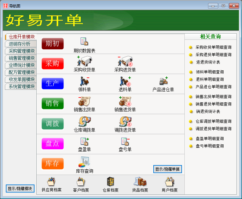 好易开单软件,是一款Windows下的进销存软件。与一般进销存软件不同,好易开单软件更强调开单的方便性和数据分析的易用性,好用易学,一看就会。 好易开单软件操作界面简明、易懂、易操作。只要您会 A、B、C,就会操作,一分钟学会, 让您远离软件"高深"而害怕使用的困扰。