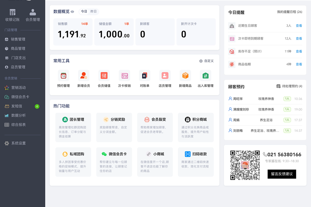 会员运营:会员积分、储值卡、计次卡管理,自动生日提醒,精准触达顾客。