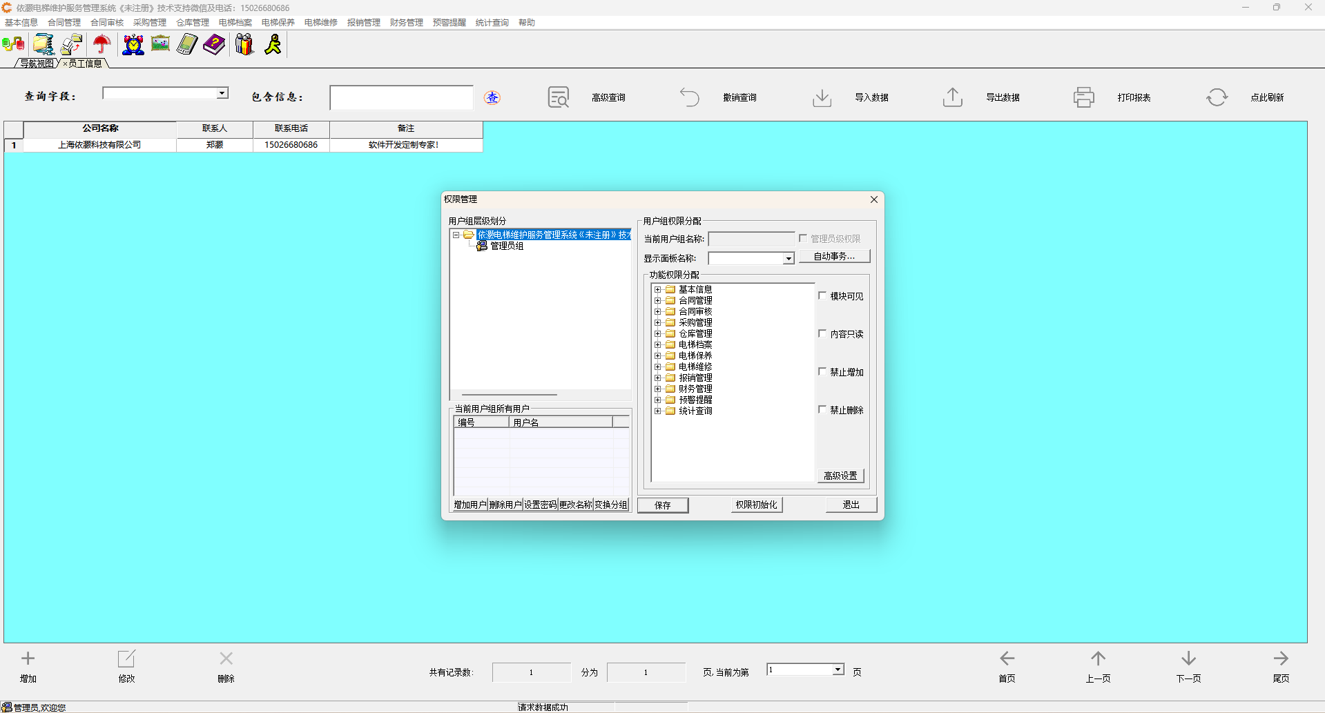 一、基本信息:公司信息、员工信息、客户信息、供应商信息二、合同管理:维保合同、维修合同、配件销售合同、电梯销售合同、安装合同、维保历史合同记录
