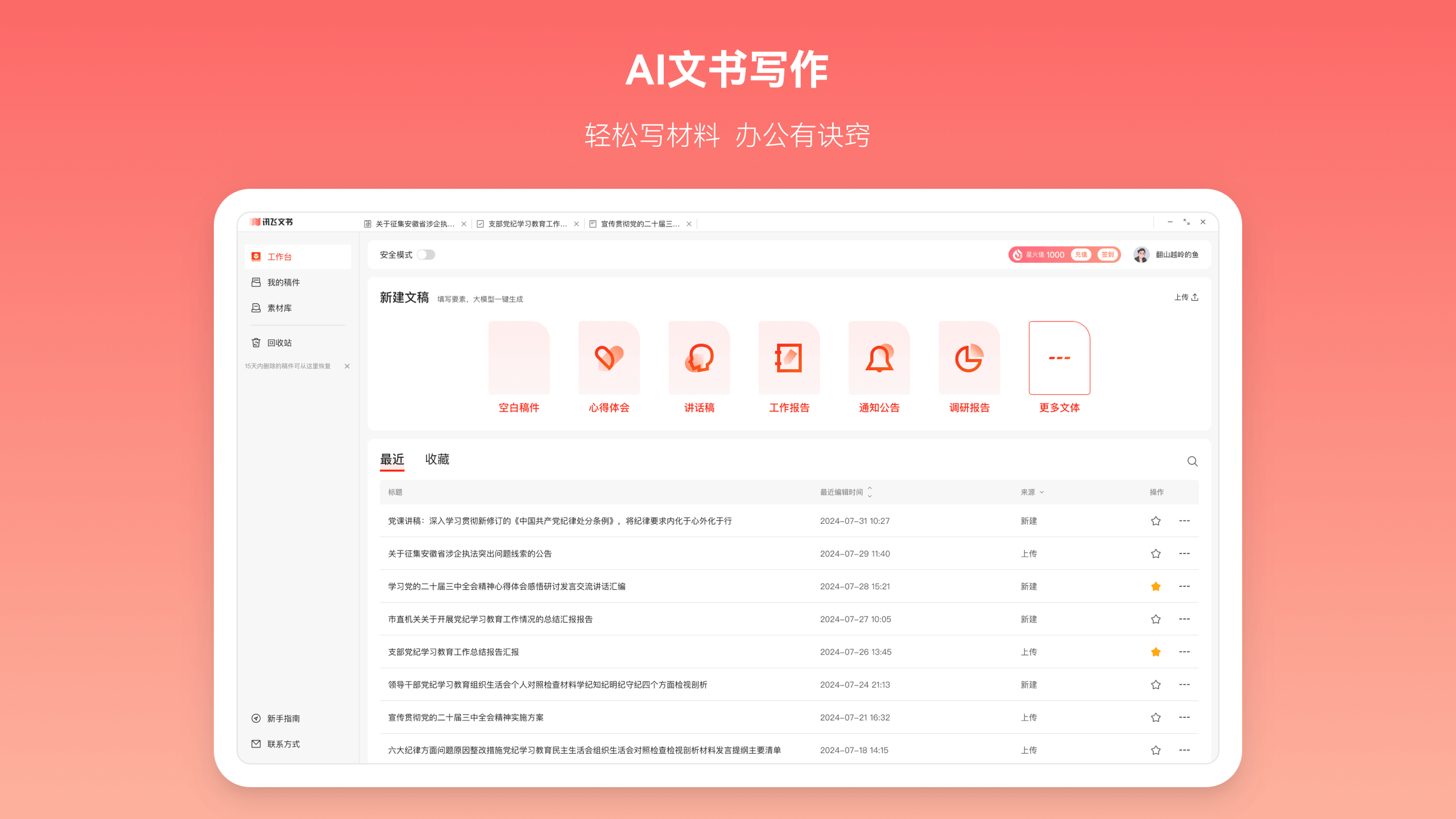 在材料写作中,素材的搜集与整理往往耗费大量时间。讯飞文书为您提供海量的素材库,让您轻松在历史文件中寻找所需内容,再也不用担心素材不足的问题。无论是经典案例、数据支撑还是专业术语,都能在这里找到。