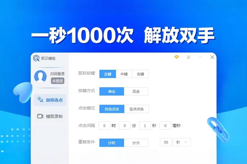 极云鼠标连点器是一款用于模拟键鼠操作的软件,支持鼠标左右键及中键点击,满足不同需求,点击事件多样性,可以实现鼠标每秒快速点击1000次,精度高更稳定;同时还支持鼠标键盘录制,自动循环回放,让游戏挂机不是梦,彻底解放双手。界面操作简单,功能高效稳定。